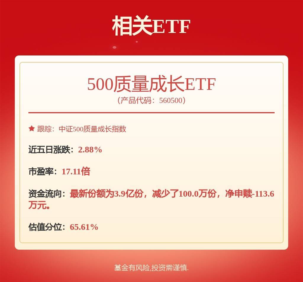 500质量成长指数(930939)由中证指数有限公司(“中证”)编制和计算,其所有权归属中证及/或其指定的第三方。中证对于标的指数的实时性、准确性、完整性和特殊目的的适用性不作任何明示或暗示的担保,不因标的指数的任何延迟、缺失或错误对任何人承担责任(无论是否存在过失)。中证对于跟踪标的指数的产品不作任何担保、背书、销售或推广,中证不承担与此相关的任何责任。本基金为被动投资的交易型开放式指数基金,主要采用完全复制策略,跟踪标的指数市场表现,具有与标的指数所表征的市场相似的风险收益特征。投资者投资于本基金面临标的指数回报与相应市场平均回报偏离、标的指数波动、跟踪误差控制未达约定目标、标的指数变更、指数编制机构停止服务、成份股停牌或退市等潜在风险。